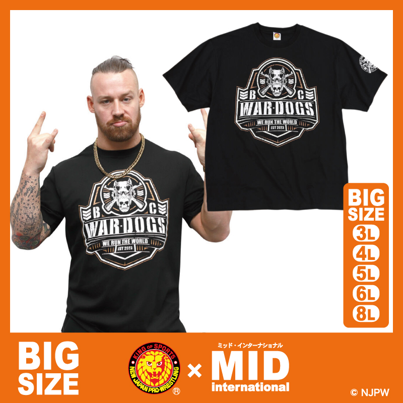 バック面は、「EST 2023」「BULLET CLUB WAR DOGS」「WE RUN THE WORLD」のフレーズを組み合わせたビッグプリント!